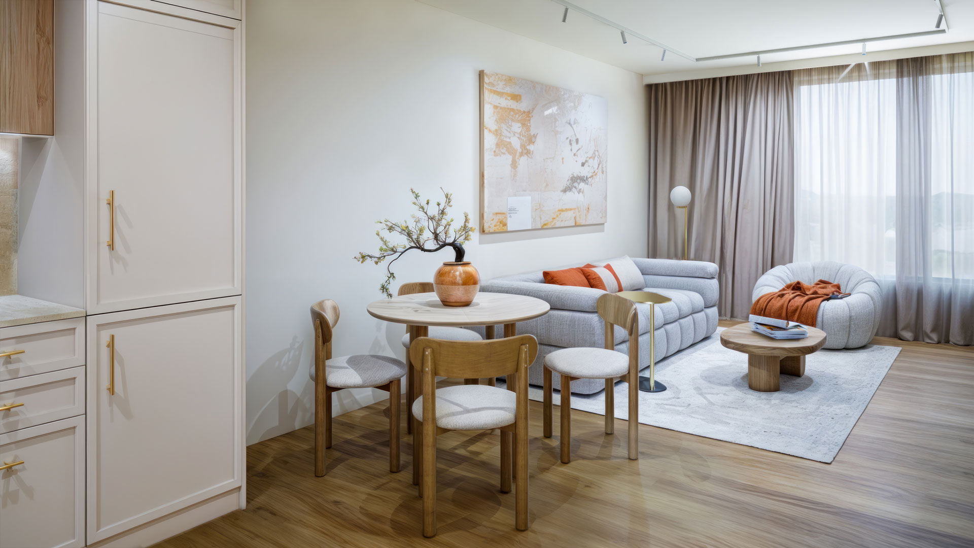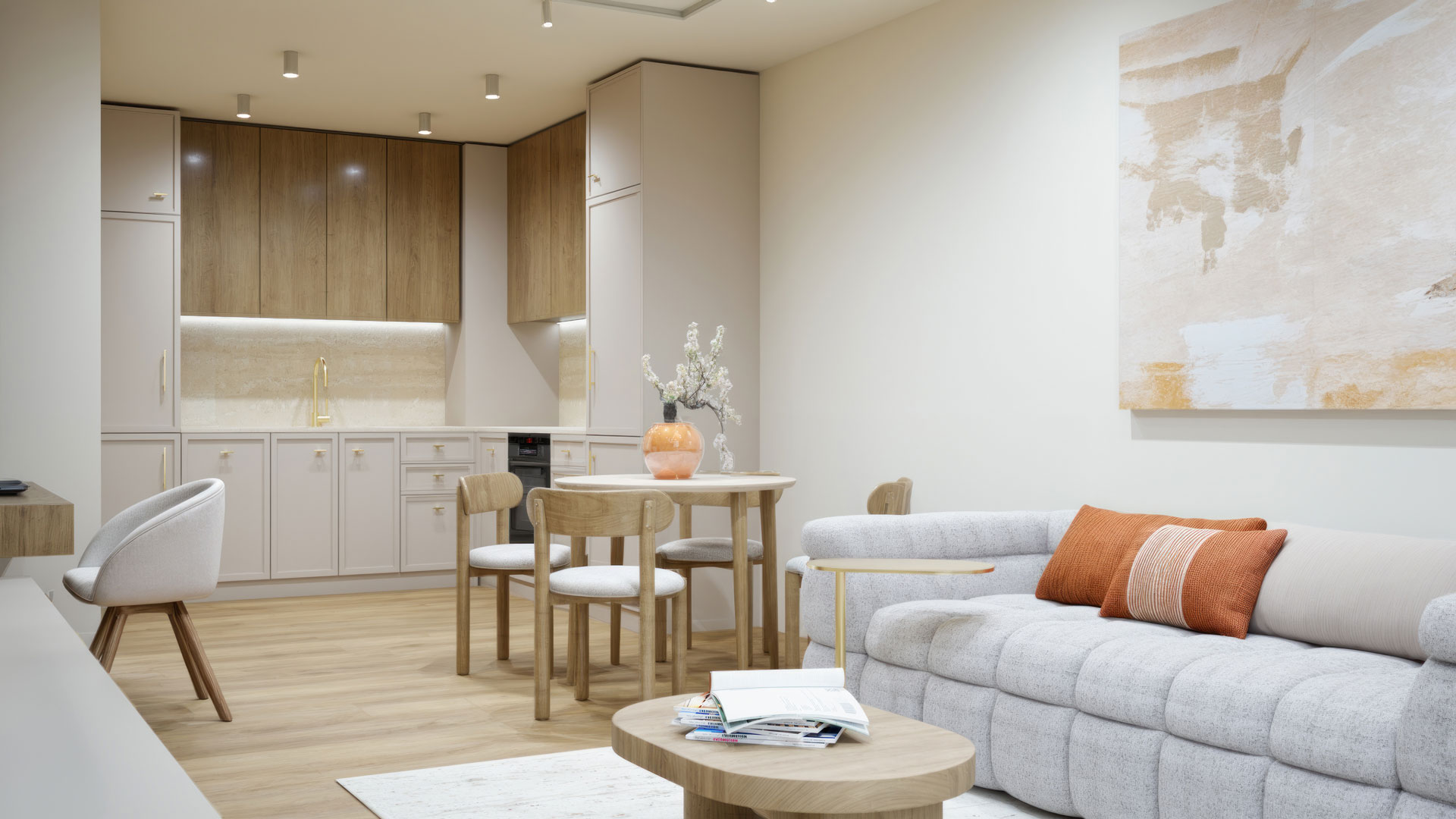 The living room was designed to be both functional and inviting, despite its compact size. A small yet efficient kitchen flows seamlessly into the space, where a round expandable dining table offers flexibility for everyday meals or hosting guests. The seating area features a beige three-seater sofa paired with an armchair—a cozy nook perfect for reading or relaxing after a long day. One of the standout elements is the custom-designed TV cabinet combined with a desk. This multifunctional piece balances practicality with elegance, incorporating subtle wooden accents that add warmth and character to the space. The result is a living room that feels open, comfortable, and perfectly suited to her lifestyle.