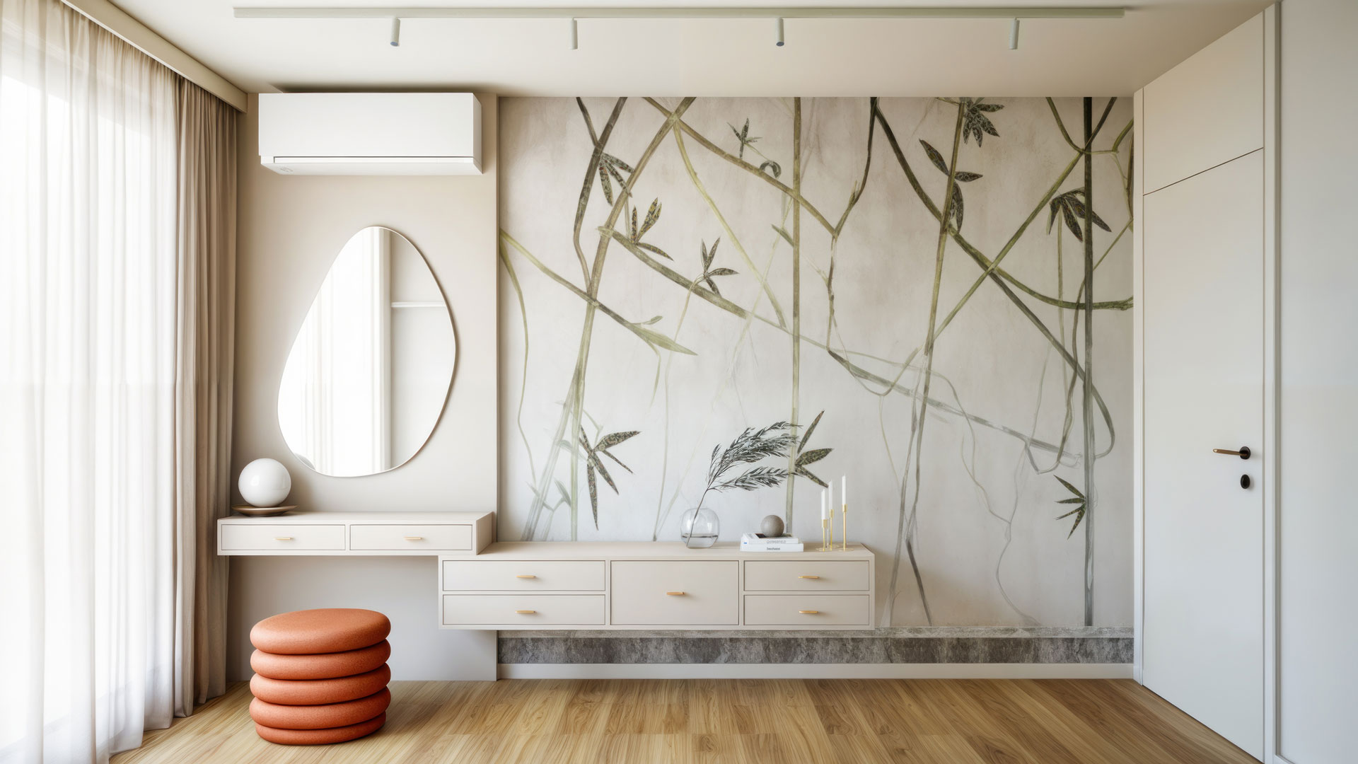 In the bedroom, storage was a top priority, but we wanted to ensure it didn’t overwhelm the space. To achieve this, we designed custom off-white furniture around the bed, creating the illusion that it’s embedded into the wall. This approach not only maximized functionality but also maintained a clean and harmonious aesthetic. To enhance the cozy atmosphere, we added pastel-colored wallpaper on the wall opposite the bed. This wall also features a practical powder desk and a small cabinet with drawers, blending functionality with understated elegance. The overall design is light, bright, and calming—an ideal retreat for her at the end of the day.