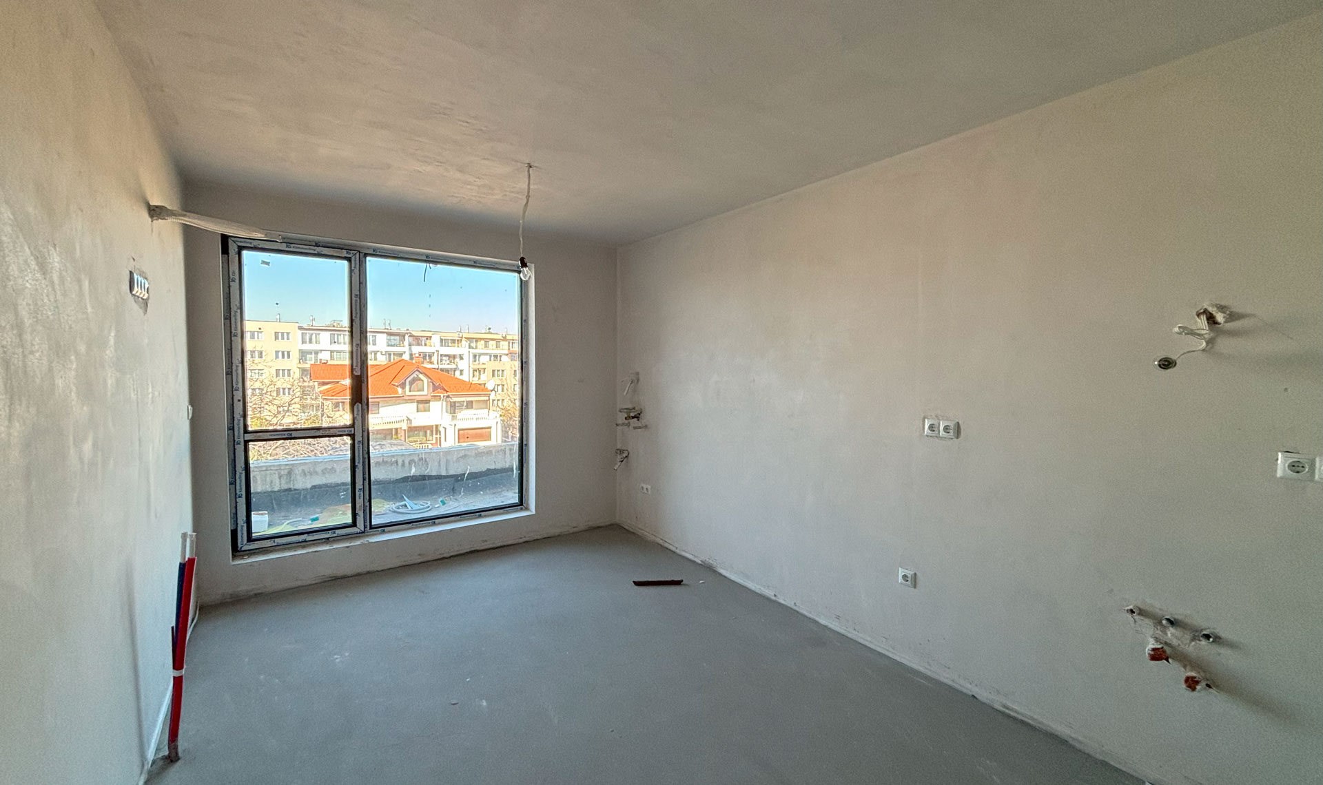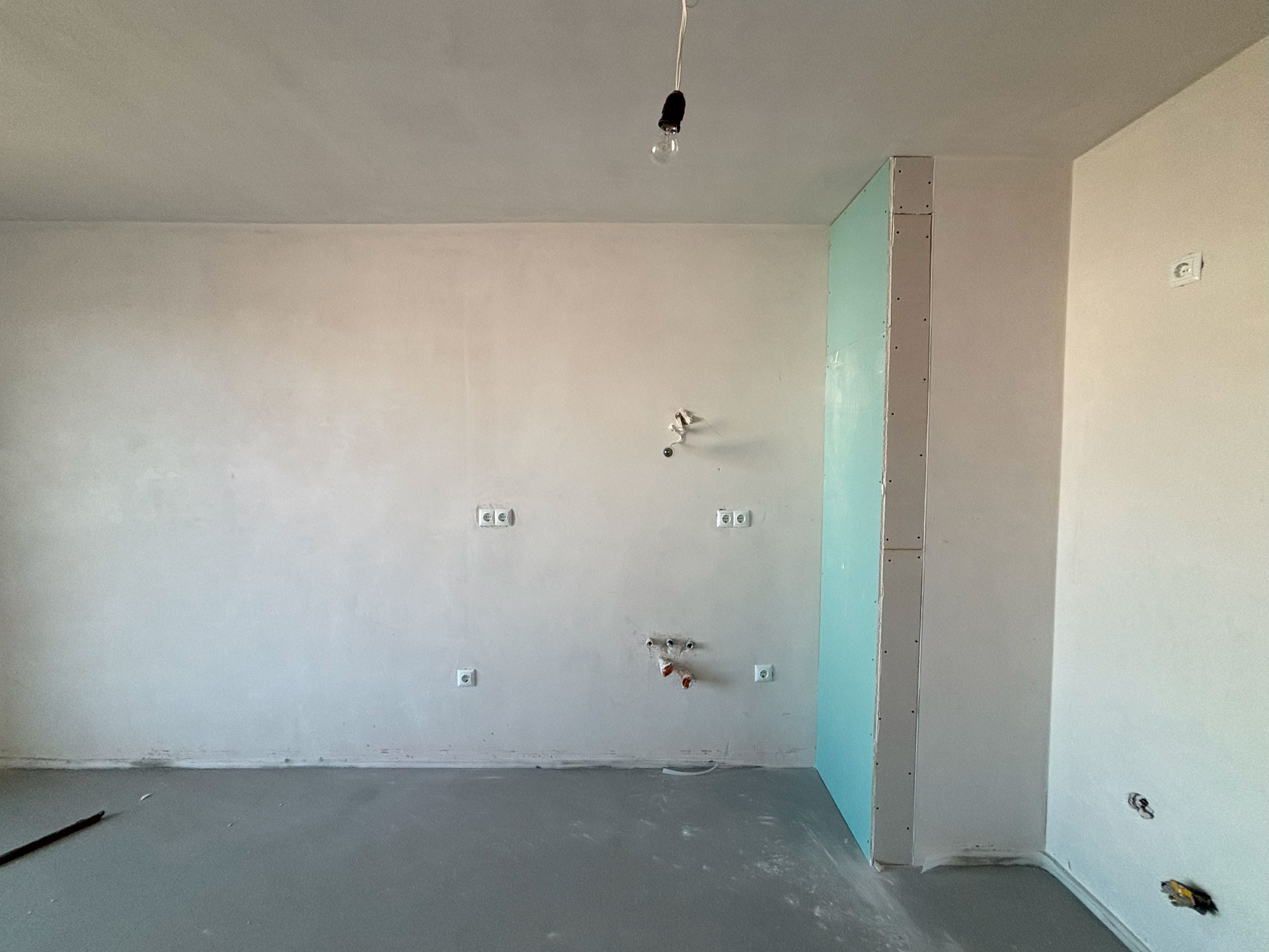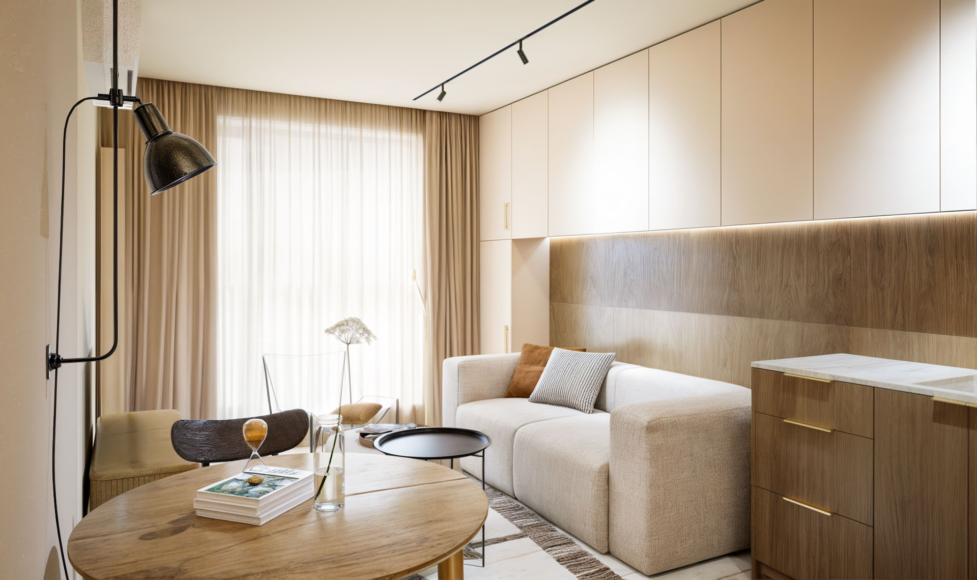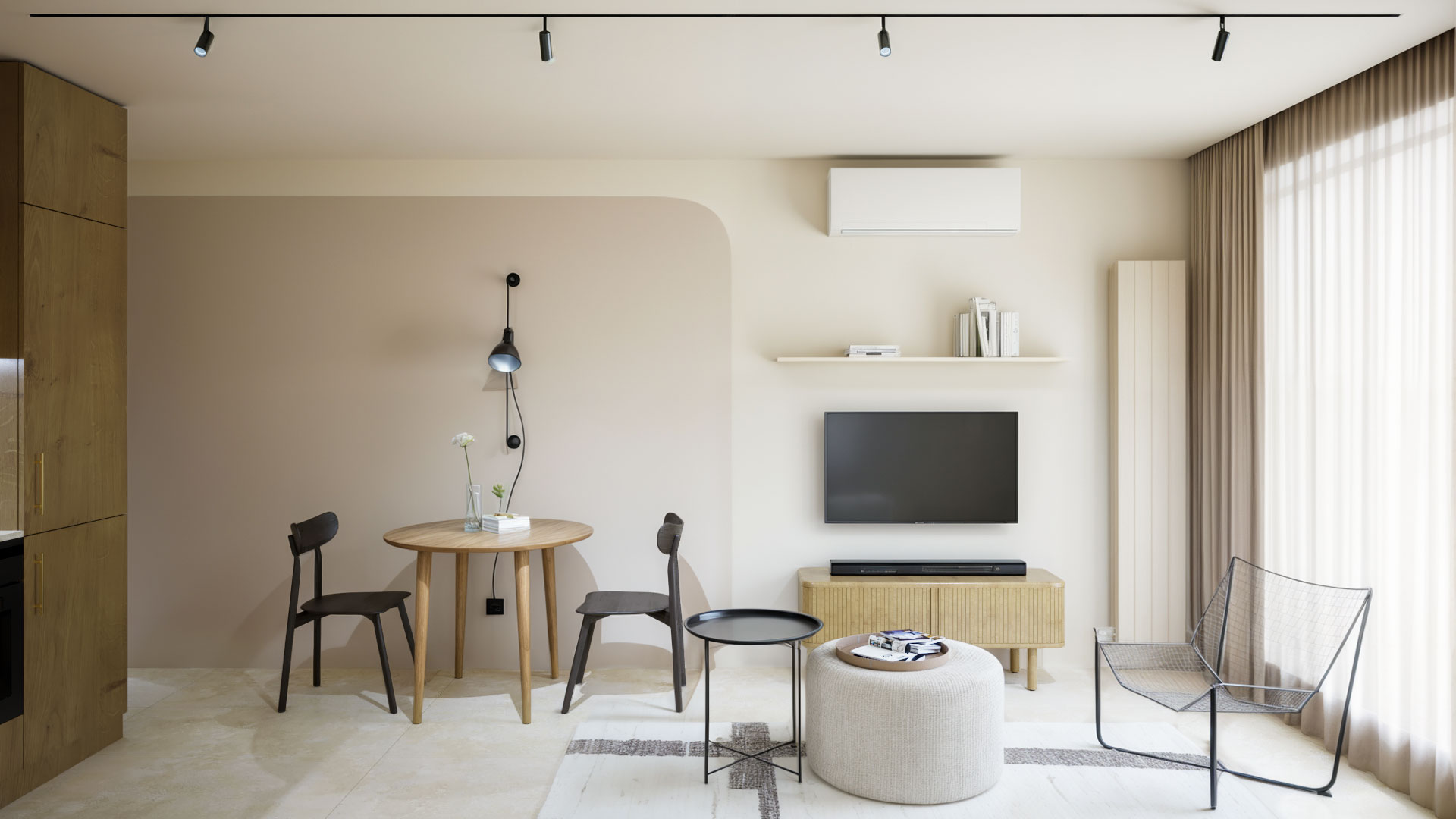 Despite its modest size, the living room includes all the essentials for modern living. A compact yet functional kitchen blends seamlessly with the space, while a round expandable dining table provides flexibility for meals or hosting guests. The seating area features a small couch and an armchair, creating a cozy corner for relaxation. To maximize functionality, the coffee table doubles as a pouf, offering additional seating when needed. The design balances practicality with elegance, making the most of every square meter.