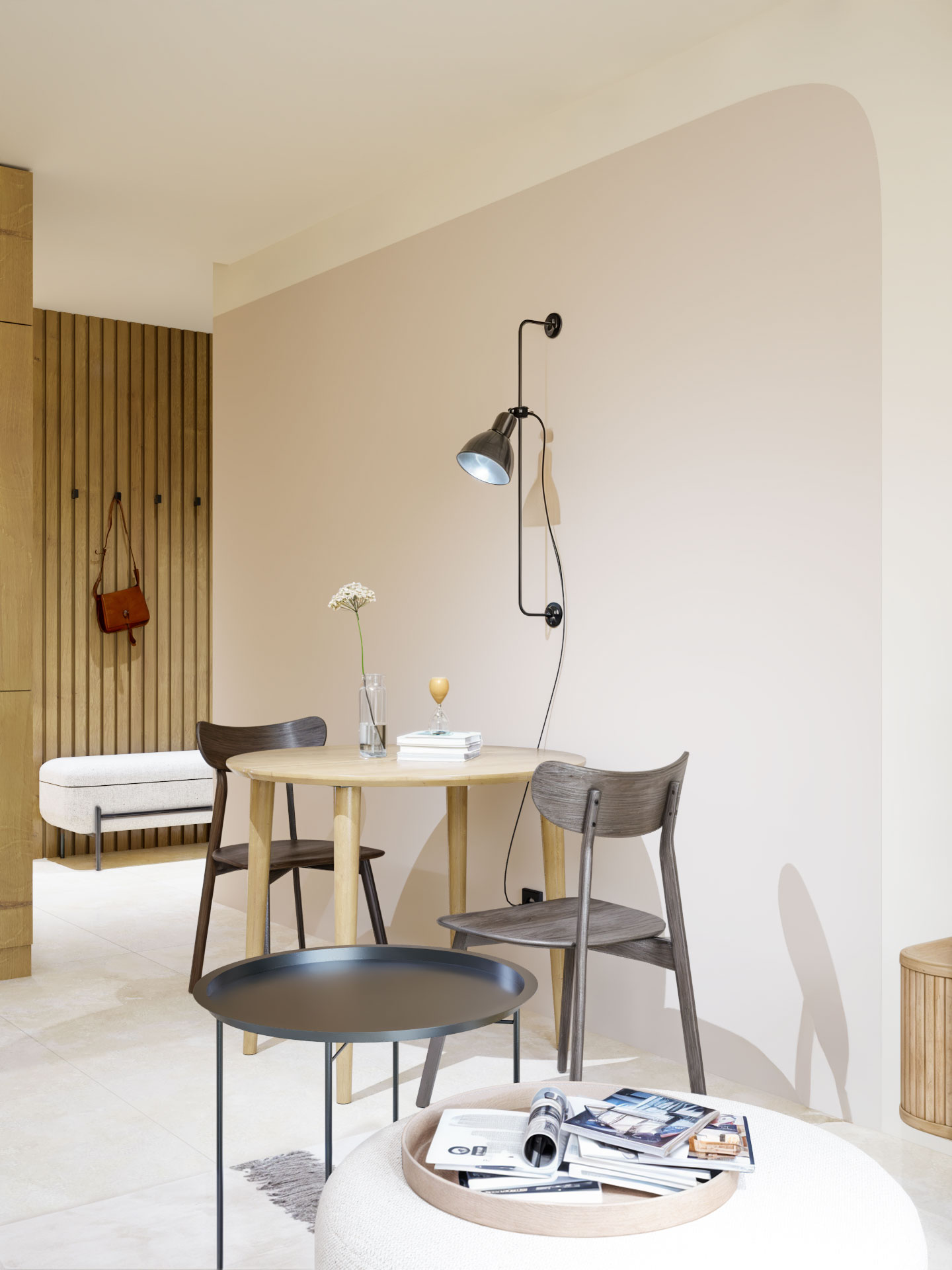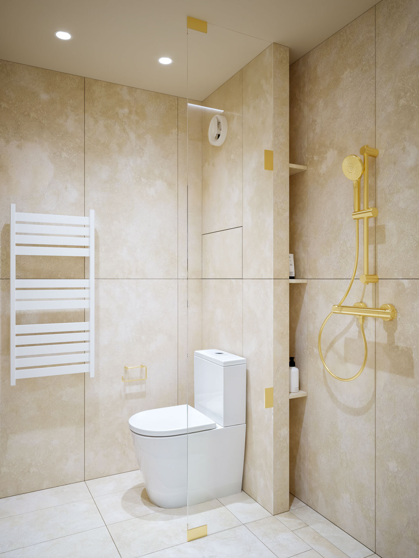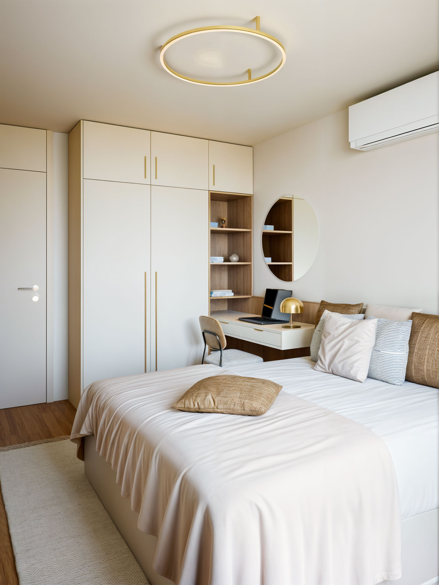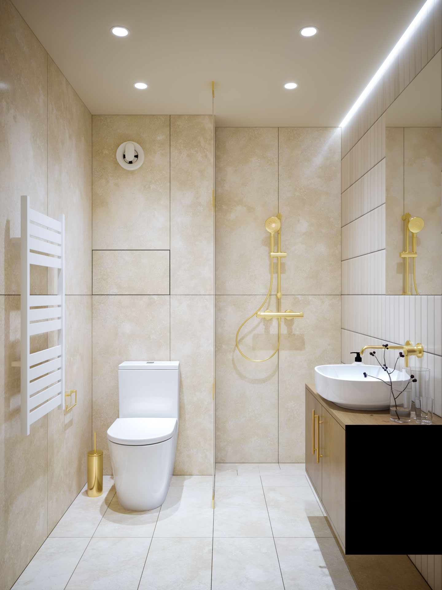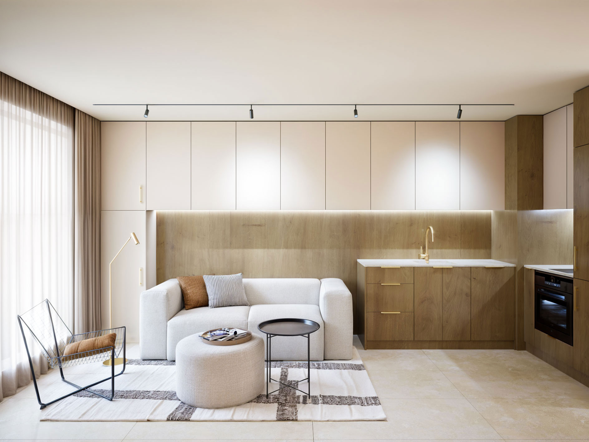 The apartment’s color palette combines soft beige tones with natural oak finishes, accented by touches of black and gold for a sophisticated yet warm atmosphere. This combination creates a timeless look that feels both modern and inviting, proving that small spaces can still have big style. This project highlights how smart planning and creative solutions can turn even the smallest apartments into functional, elegant homes tailored to their owners’ needs.