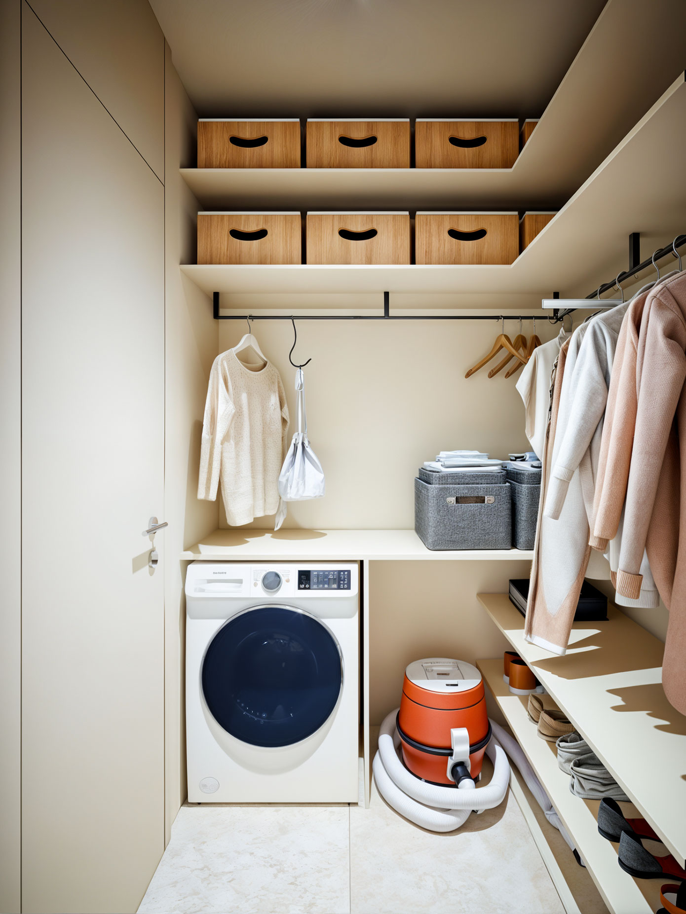 Even the small entryway was optimized with practical solutions. A slim shoe cabinet and ottomans with storage provide organization and convenience for everyday use. A wall-mounted mirror visually expands the space and adds the finishing touch to this compact yet functional area.